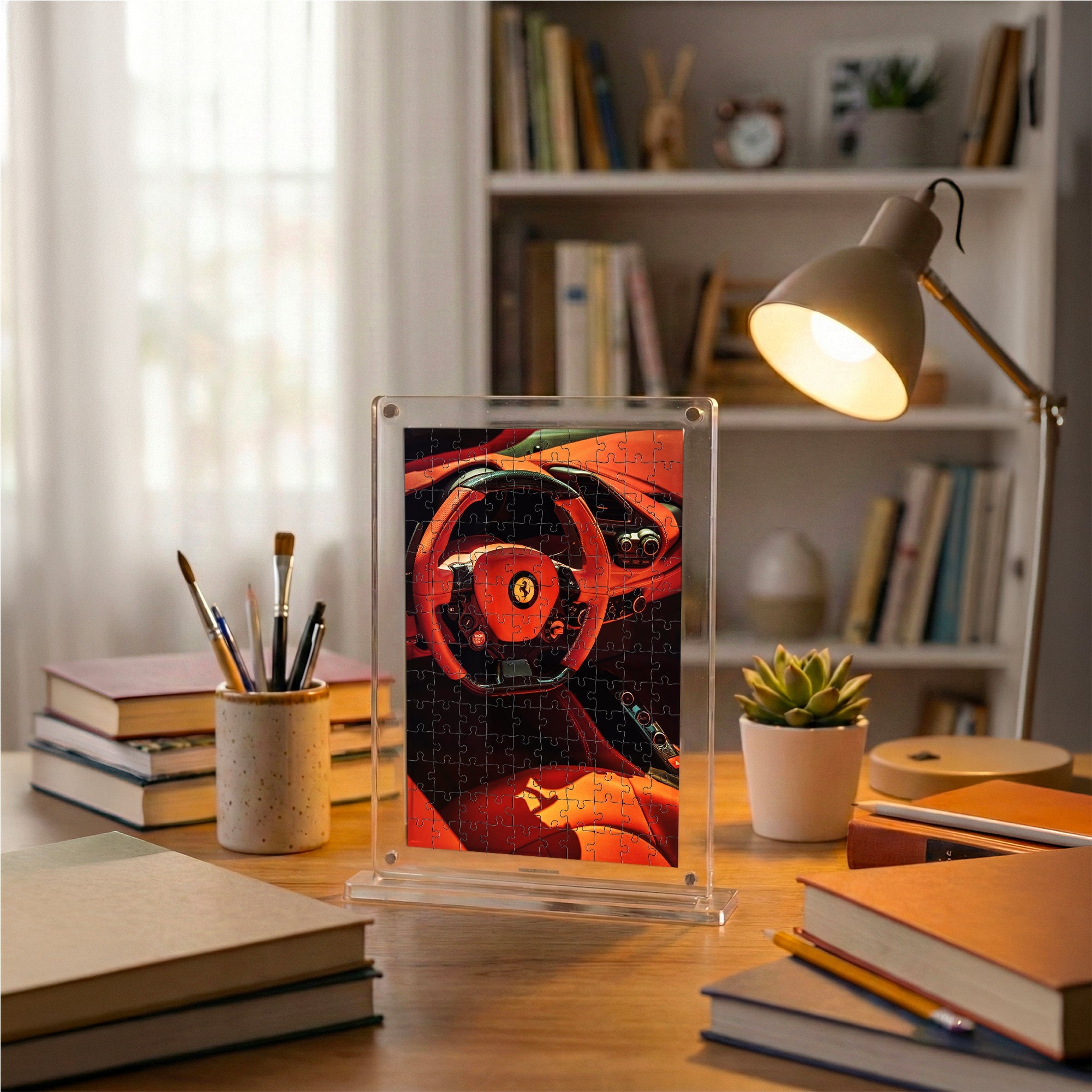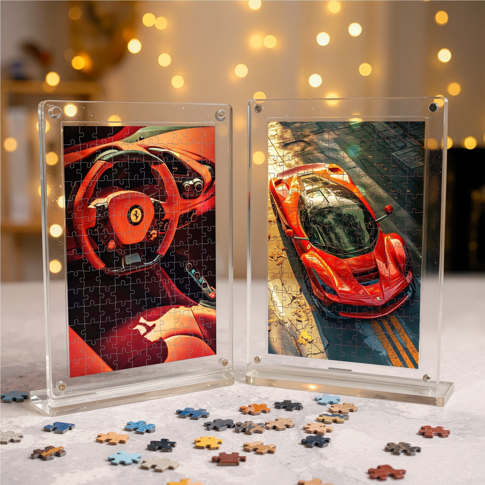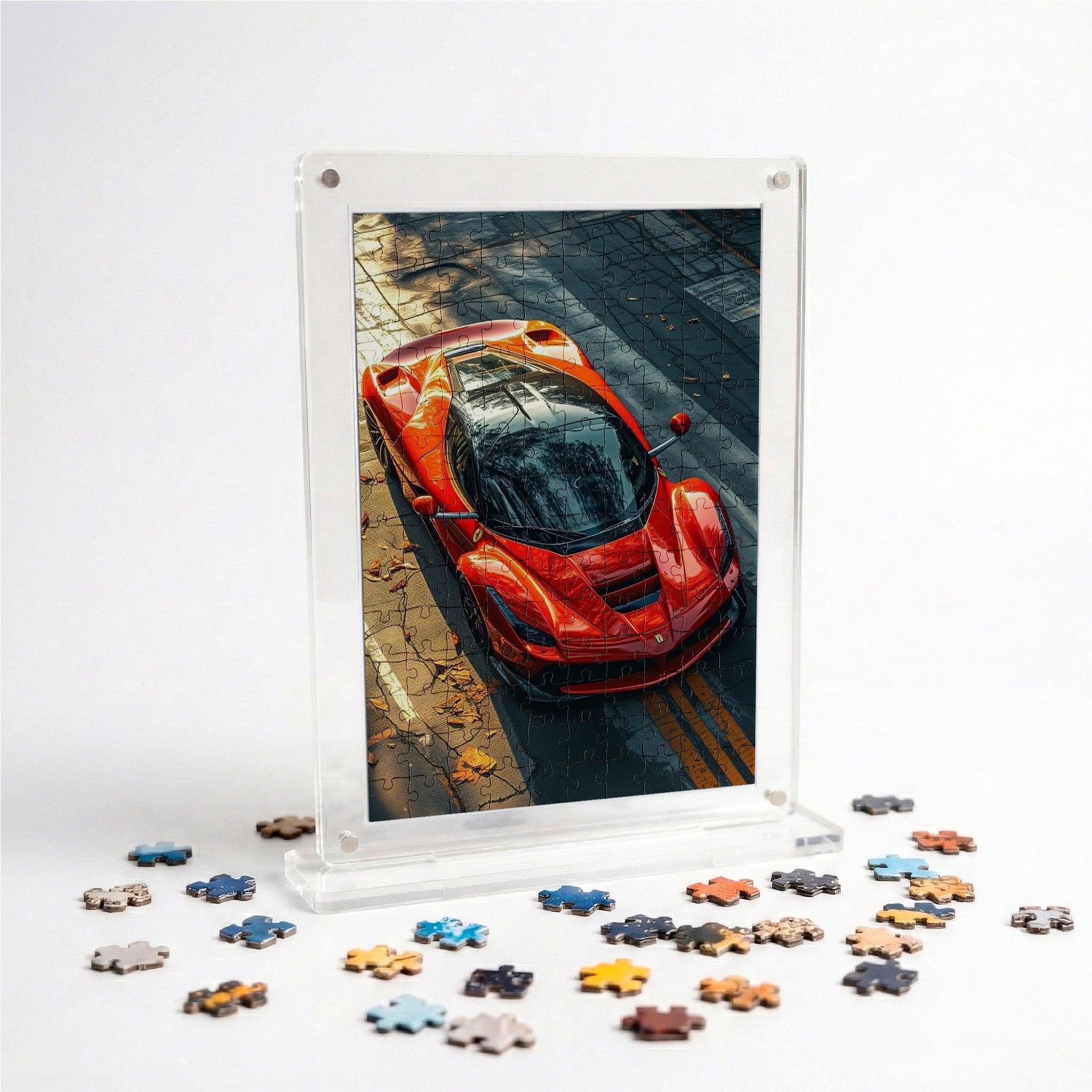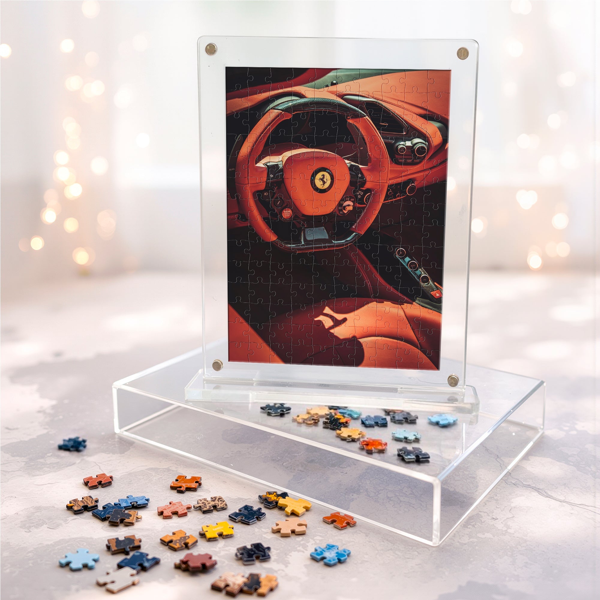 Experience Italian performance and luxury in puzzle form with the Ferrari Acrylic Automotive Frame Puzzle – 140 Pieces. Featuring breathtaking high-definition artwork of a red Ferrari—capturing both the sleek interior cockpit and dynamic supercar exterior—this puzzle celebrates speed, design, and automotive excellence.